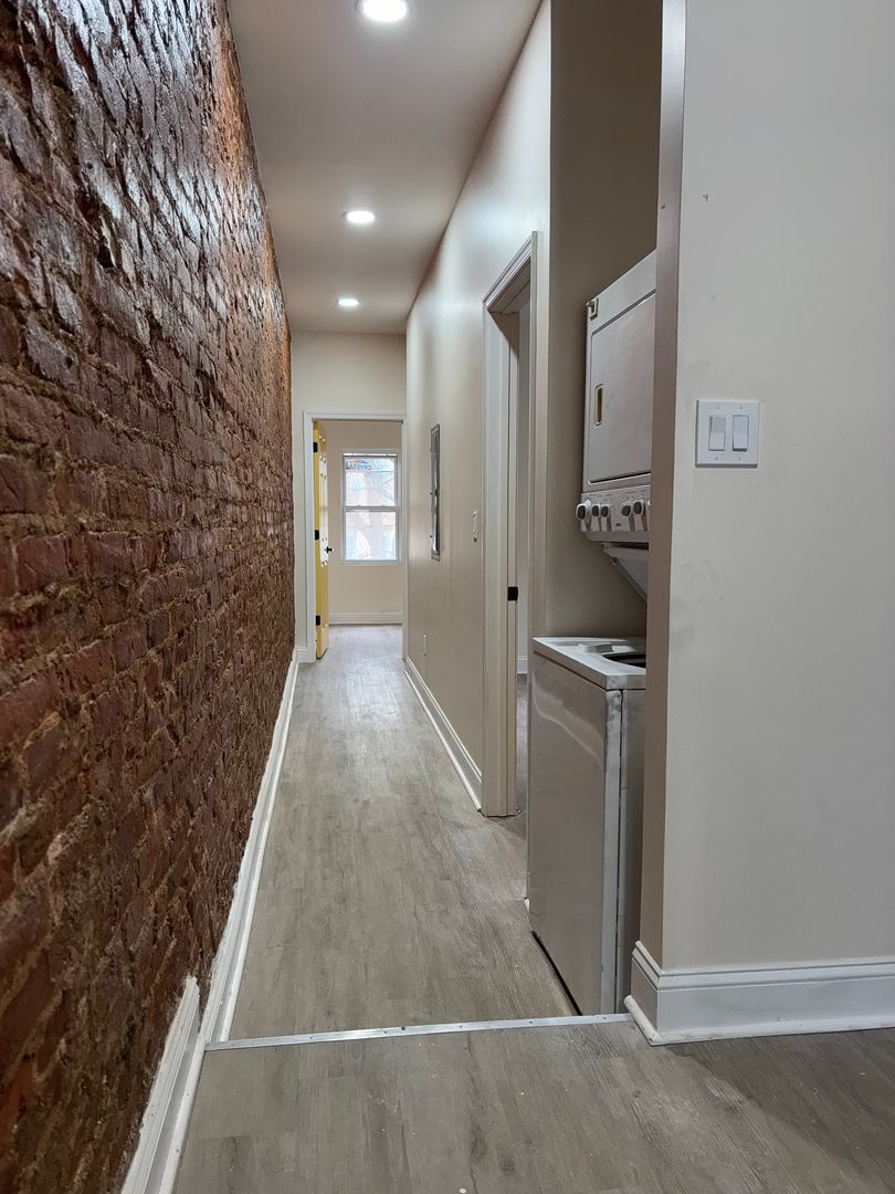 Exposed Brick Charm – A stunning brick-lined hallway leads you to both bedrooms, adding warmth and character to the space.